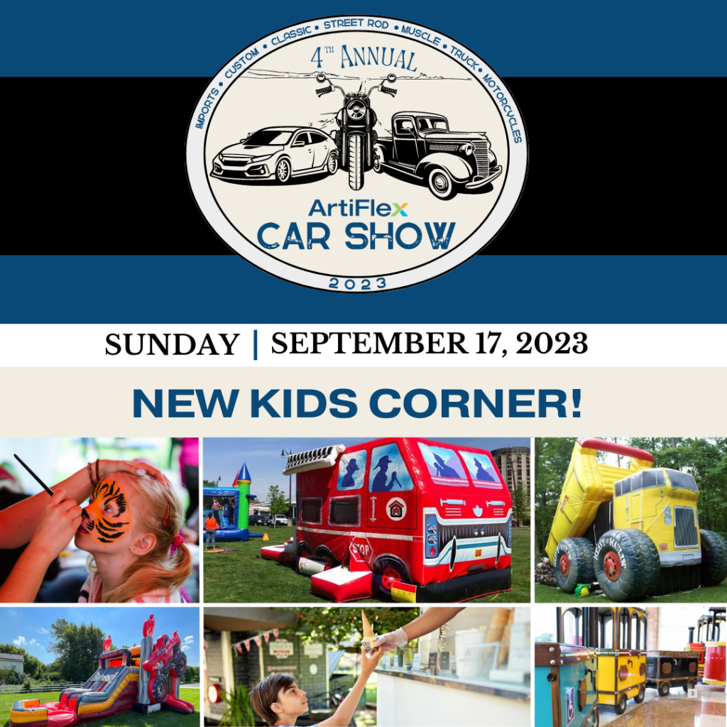 Calling all families! Unleash the fun at ArtiFlex’s 4th Annual Car Show Kid’s Corner addition! 🚗🎈🍦 Join us for a day of excitement with bounce houses, delicious ice cream, face painting, balloon animals, a caricature artist, and a whimsical trackless train. The little ones are in for a treat – let their imaginations run wild…